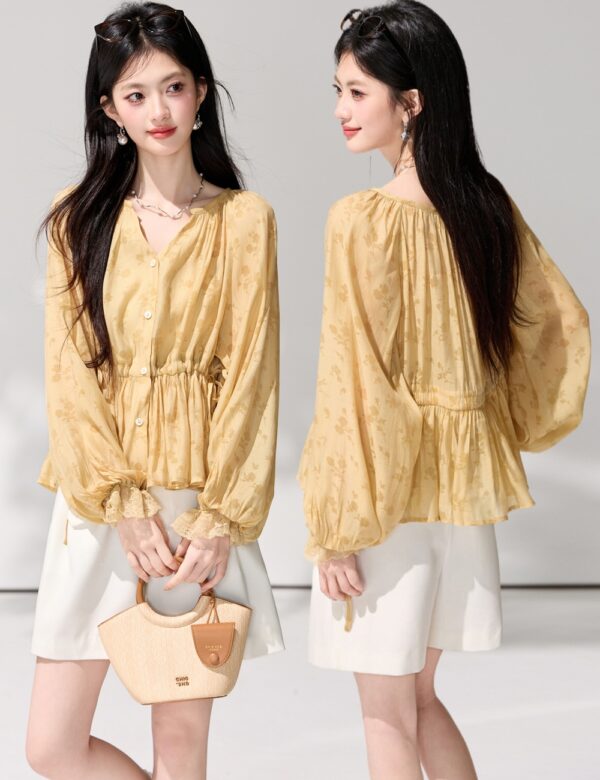 Lantern sleeve printing obscure shirt drawstring spring tops
