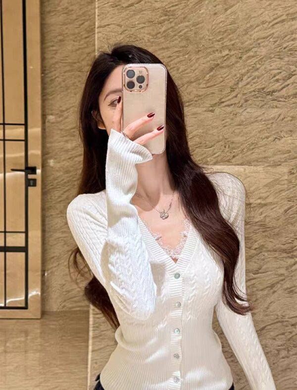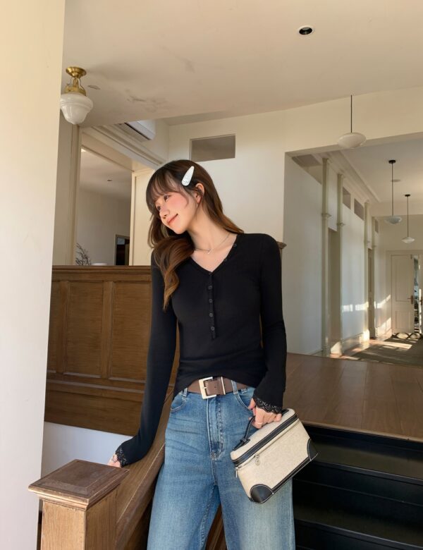 Lace spring tops long sleeve V-neck T-shirt for women