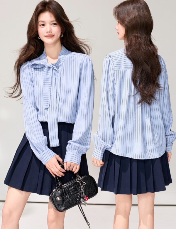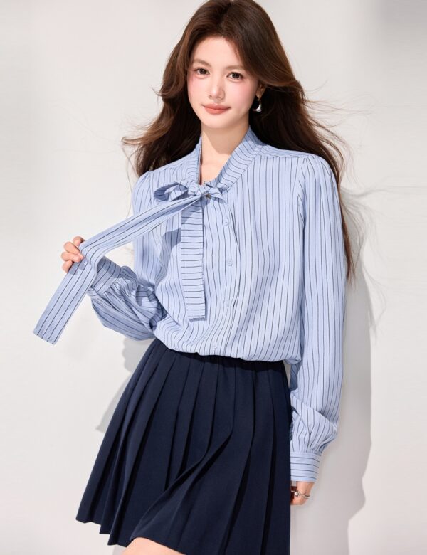 All-match refreshing spring stripe tops bandage slim bow shirt