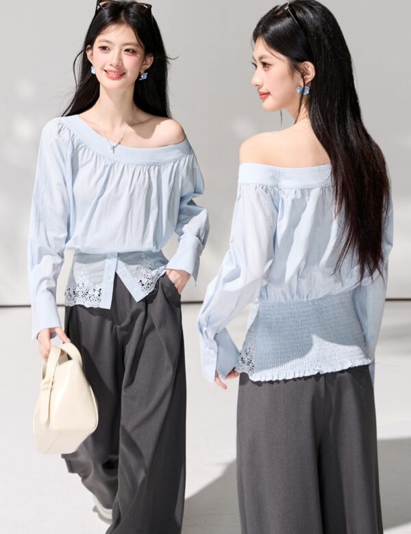 Strapless loose oblique collar tops lace irregular shirt