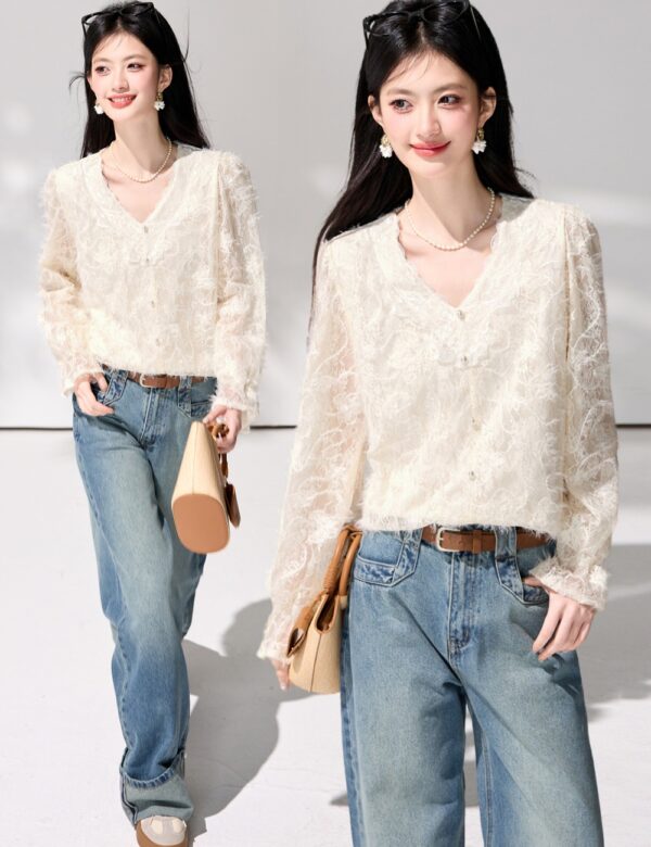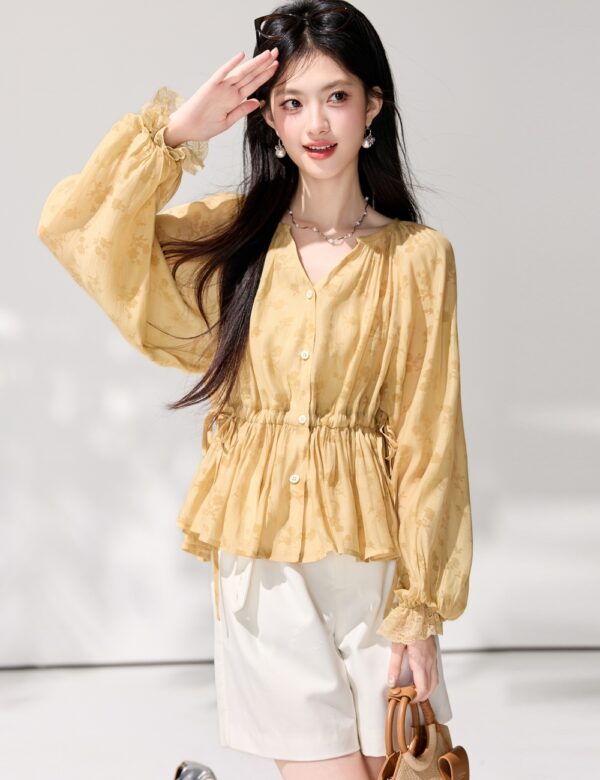 France style pinched waist frenum tops spring V-neck shirt