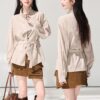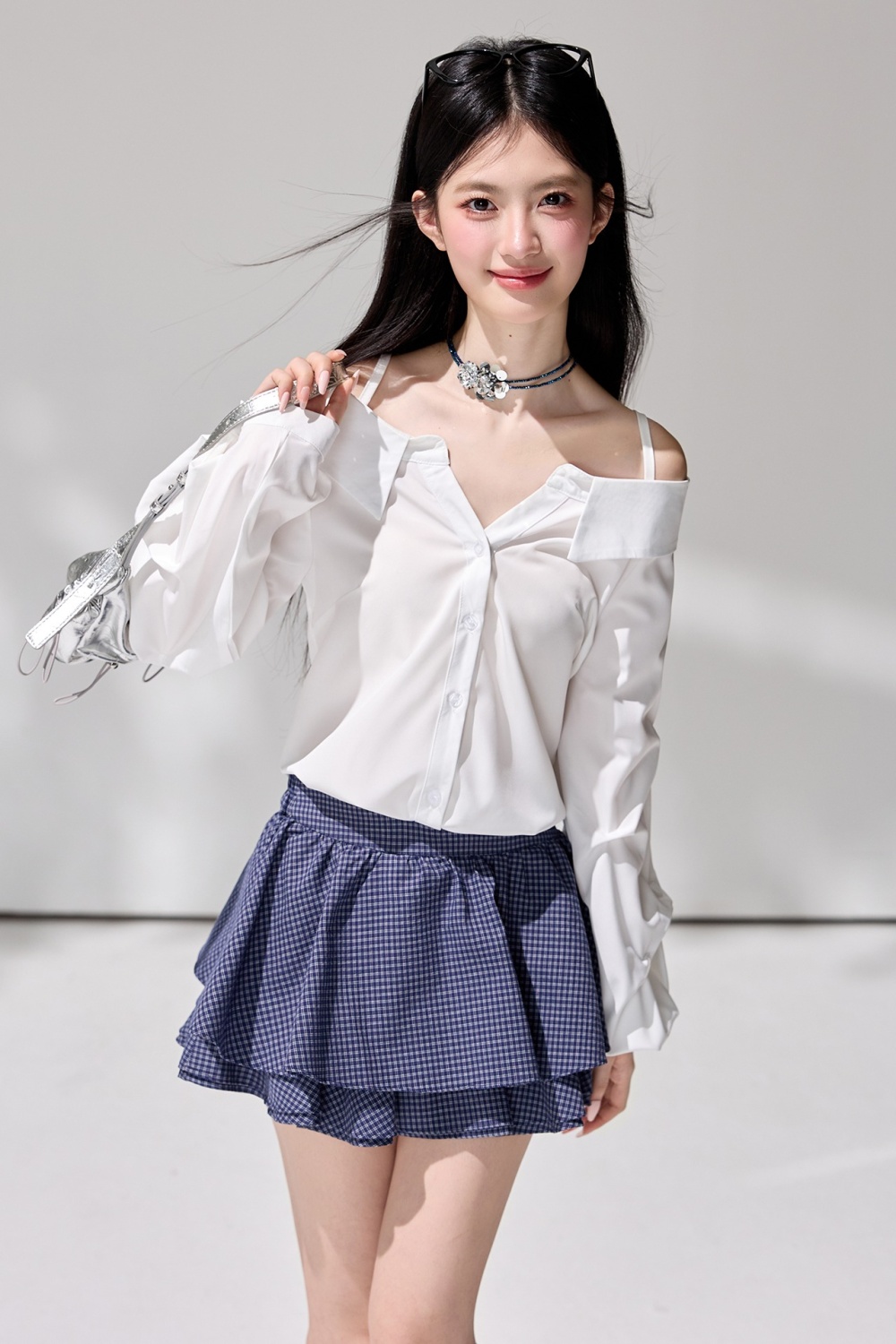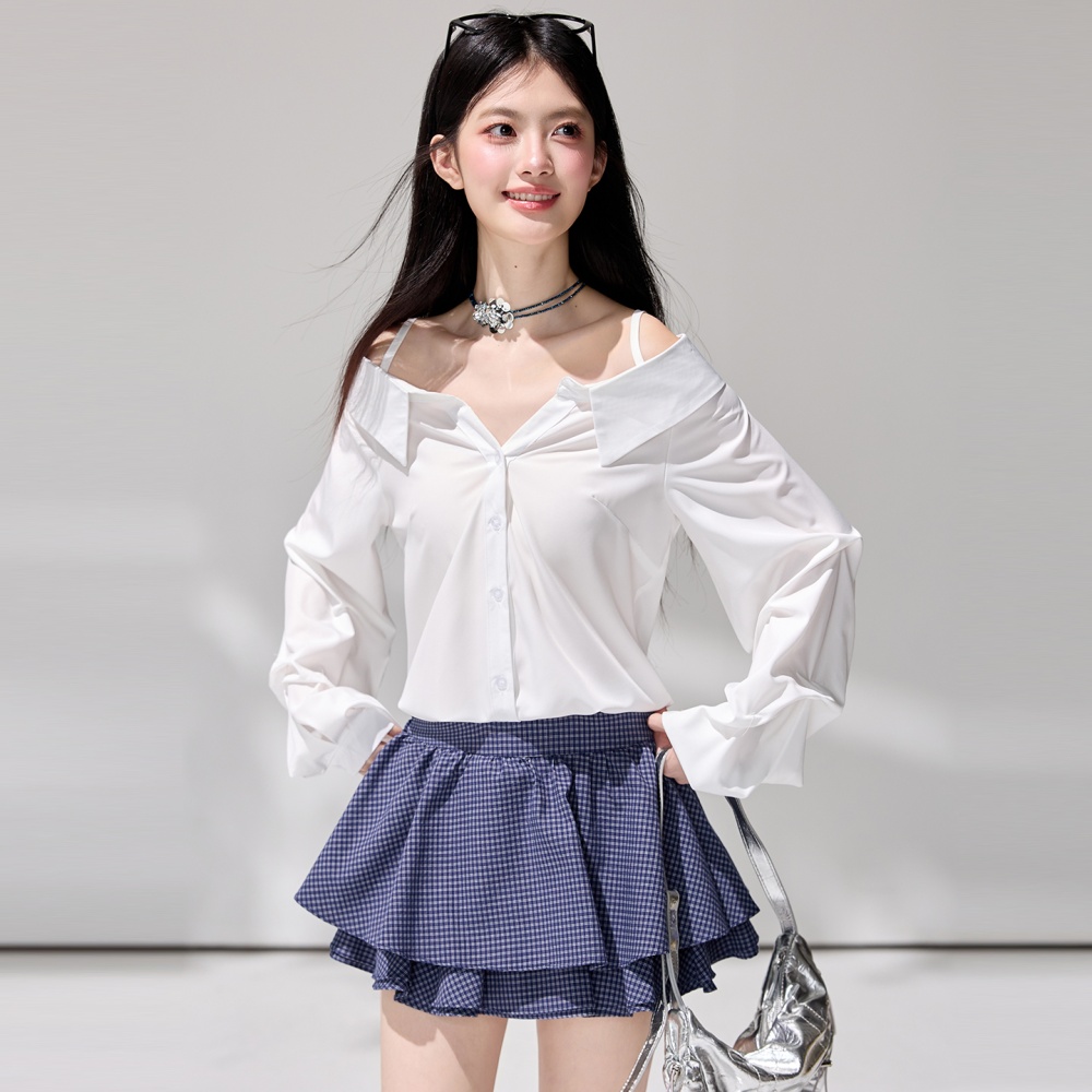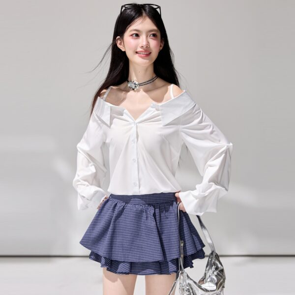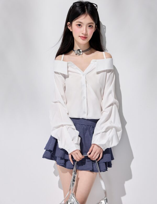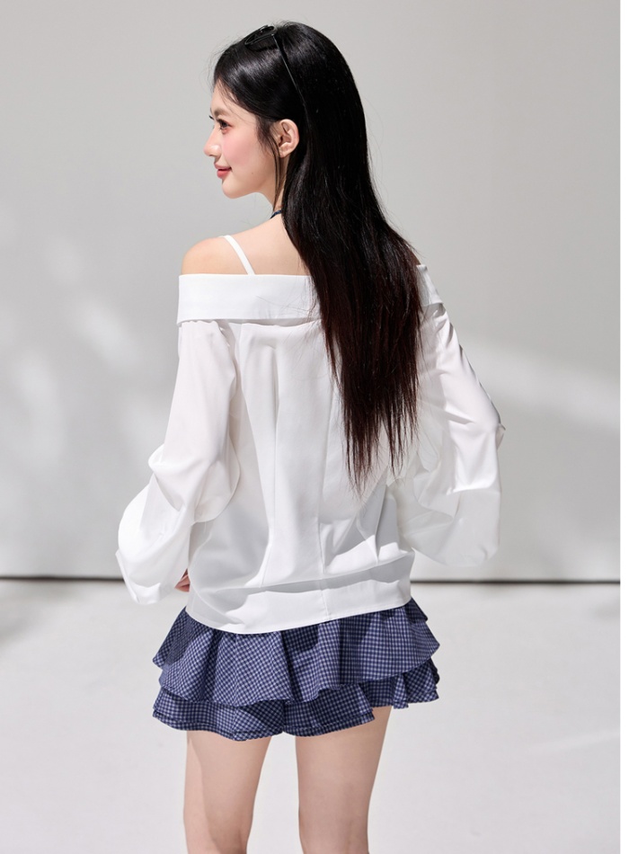 Puff sleeve irregular V-neck tops strapless sling shirt